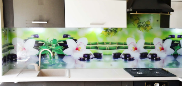 - В изготовлении мебели. Для оформления лицевой части шкафов-купе, кухонного фартука (скинали). Он служит для защиты стены вдоль рабочей поверхности и защищает ее от брызг, жира, грязи. Является одной из самых распространенных областей, где применяются такие поверхности. Они практичны, долговечны, не выгорают со временем, обладают высокой прочностью, стойкостью к влаге и перепадам температур. Рисунок на них может быть самым разнообразным. Он наносится на ту сторону поверхности, которая прилегает к стене. Важной особенностью продукции является не только максимальная цветопередача и ее насыщенность, но и безопасность, благодаря нетоксичным чернилам.